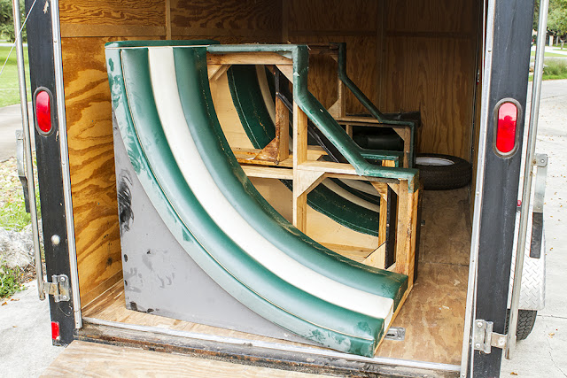 The Gill-Man was a fun addition, but it had never been part of my master plan for the Lagoon of Mystery. This next addition is a huge step toward fulfilling that master plan. As I've said before, the Lagoon of Mystery is primarily occupying a 65' covered patio. Thus far, we've tikified about half of that covered space. The farthest end, below, remains mostly untouched. I use it for my work area and it's normally somewhat cluttered. When we have gatherings, nobody goes there, because there's no reason to. My grand vision, however, was to have this as the "cool spot" to hang out. I call it "Mermaid Cove" because of the silhouette painted on the ceiling. I wanted to install a circular restaurant booth here as a sort of physical statement "This is the end of the tiki bar." The only trouble was that new booths are crazy expensive. I'd resigned myself to build one, but I couldn't find any plans online that matched what I envisioned. Even with plans, the build would tax my modest carpentry and upholstery skills.